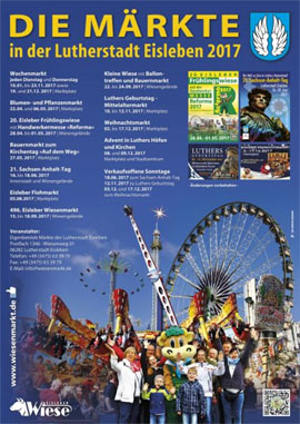 Den Eisleber Wiesenmarkt, das größte Volksfest in Mitteldeutschland, öffnet am dritten Septemberwochenende, vom 19. bis 22. September 2025, gefolgt von der „kleinen Wiese“ am vierten Septemberwochenende, vom 26. bis 28. September 2025, freitags bis sonntags in der Lutherstadt Eisleben. Auf einer Fläche von acht Fußballfeldern finden Sie 350 Aussteller: eine Vergnügungsmeile von vier Kilometern Länge!