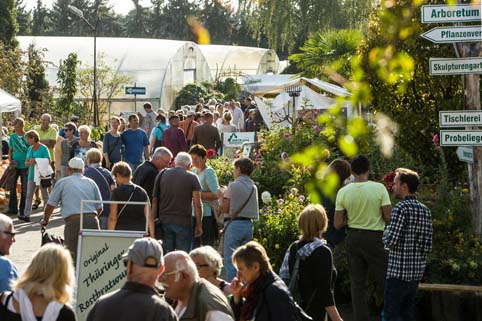 Der Gräser-Schaugarten ist in voller Pracht, Kürbisse in allen Formen und Farben schmücken die Festwiese und Dahlien blühen rund um den Hofcafé-Brunnen. Alle Sorten können bestellt werden. Im Vortragszentrum an der Eichenallee sind Vorführungen zu Gehölzschnitt und Rasenpflege der Renner. Ein Pomologe bietet die Obstsortenbestimmung an. Die große Apfelausstellung führt hunderte verschiedener Apfelsorten vor. 200 Ausstellerinnen und Aussteller bieten gärtnerische Ideen und schöne Pflanzen für Garten, Terrasse und Balkon.