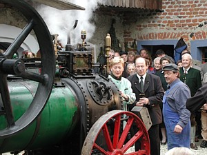 Getreide wird mit einer alten Dreschmaschine gedroschen die von einer 130 Jahre alten Dampfmaschine angetrieben wird.