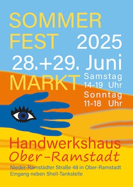 Sommerfest und Markt am vierten Juniwochenende, dem 28. und 29. Juni 2025, samstags von 14:00 bis 19:00 Uhr und sontags von 11:00 bis 18:00 Uhr im Handwerkshaus Ober-Ramstadt.