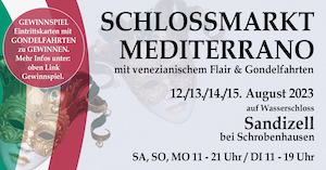 Der südländische Erlebnismarkt Mediterrano öffnet am dritten Augustwochenende, vom 15. bis 17. August 2025, samstags bis montags von 11:00 bis 21:00 Uhr, dienstags von 11:00 bis 19:00 Uhr auf Schloss Sandizell in Schrobenhausen.