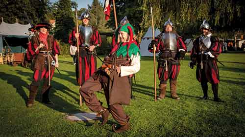 Eure Kindelein und Kegel werden sich gar wohlgemut amüsieren, wenn sie alte Handwerkskünste selbst erleben oder die Münder bei der Gaukelei nicht mehr zu schließen vermögen. Fleisch aus der Bräterey, eine wohlschmeckende Pfanne mit weißköpfigen Wiesengewächsen, knusprige Backwaren und bretonische Eierkuchen - diese wohlschmeckenden Speisen werden Labsal für geschundene Körper, Geist und Seelen sein. Ob mit maurischem Bohnensud oder süßem Met an dieser Stätten muss keine Kehle verdorren.